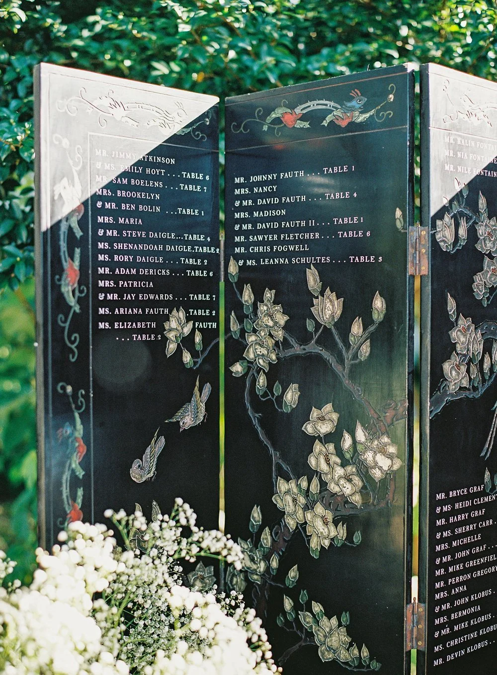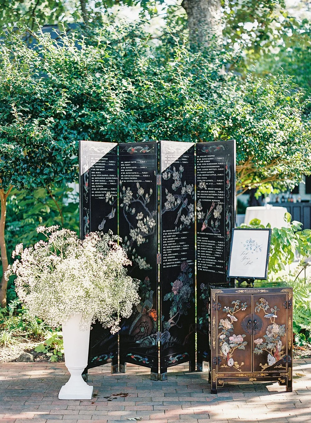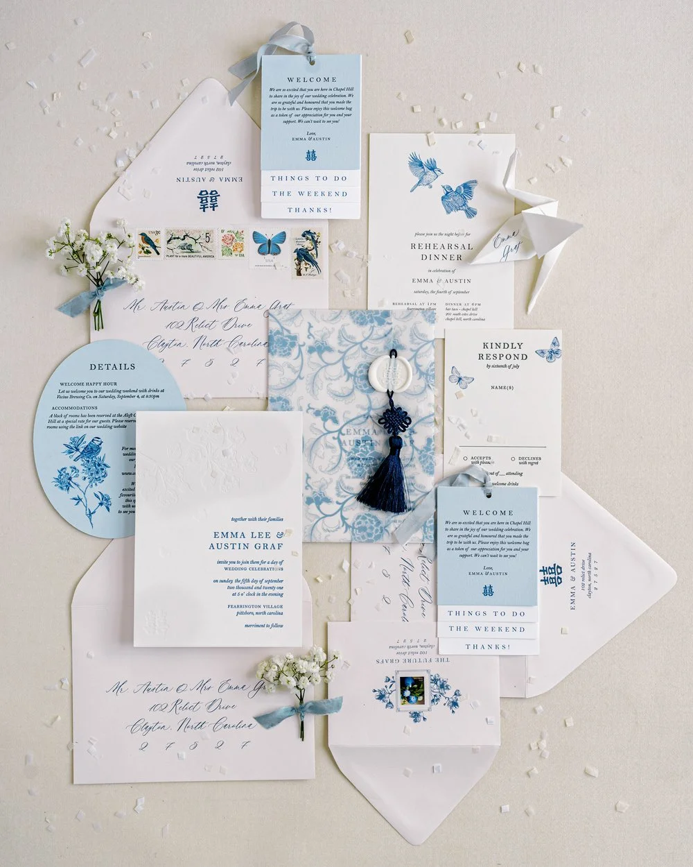 The delicate beauty of Chinoiserie intertwines with the Southern charm of North Carolina at this enchanting Garden Wedding. From the first glimpse of the invitation suite, adorned with intricate Chinoiserie patterns and sealed with symbols of Chinese weddings, guests embark on a journey of harmonized tradition and modernity. As guests arrive, they are welcomed with curated bags reflecting the couple's unique history and passions, setting the tone for a celebration filled with warmth and joy. A vintage oriental screen, a cherished heirloom from the groom's family, serves as a captivating backdrop for the seating chart, guiding guests to their seats with elegance and grace. At the heart of the reception, custom fabric runners adorned with motifs echoing the invitation suite adorn the head table, weaving a thread of continuity and intimacy among loved ones. Each detail, meticulously crafted and thoughtfully chosen, invites guests to share in the love story of two souls united in the splendor of a Chinoiserie Garden Soirée.