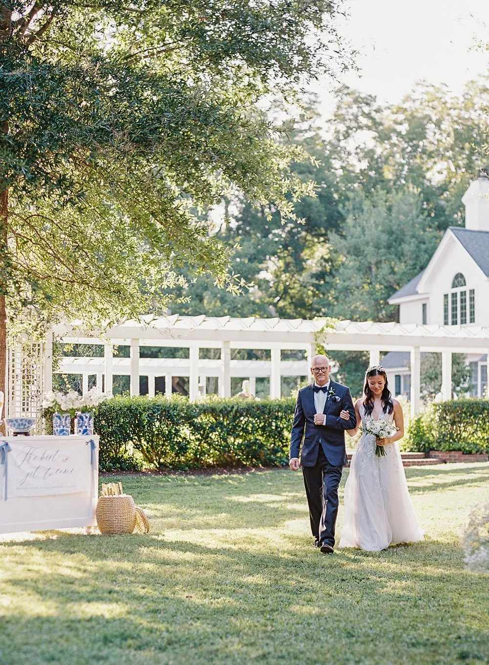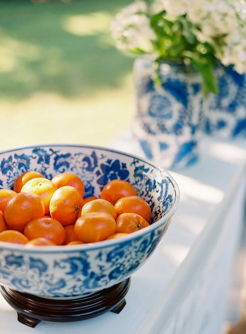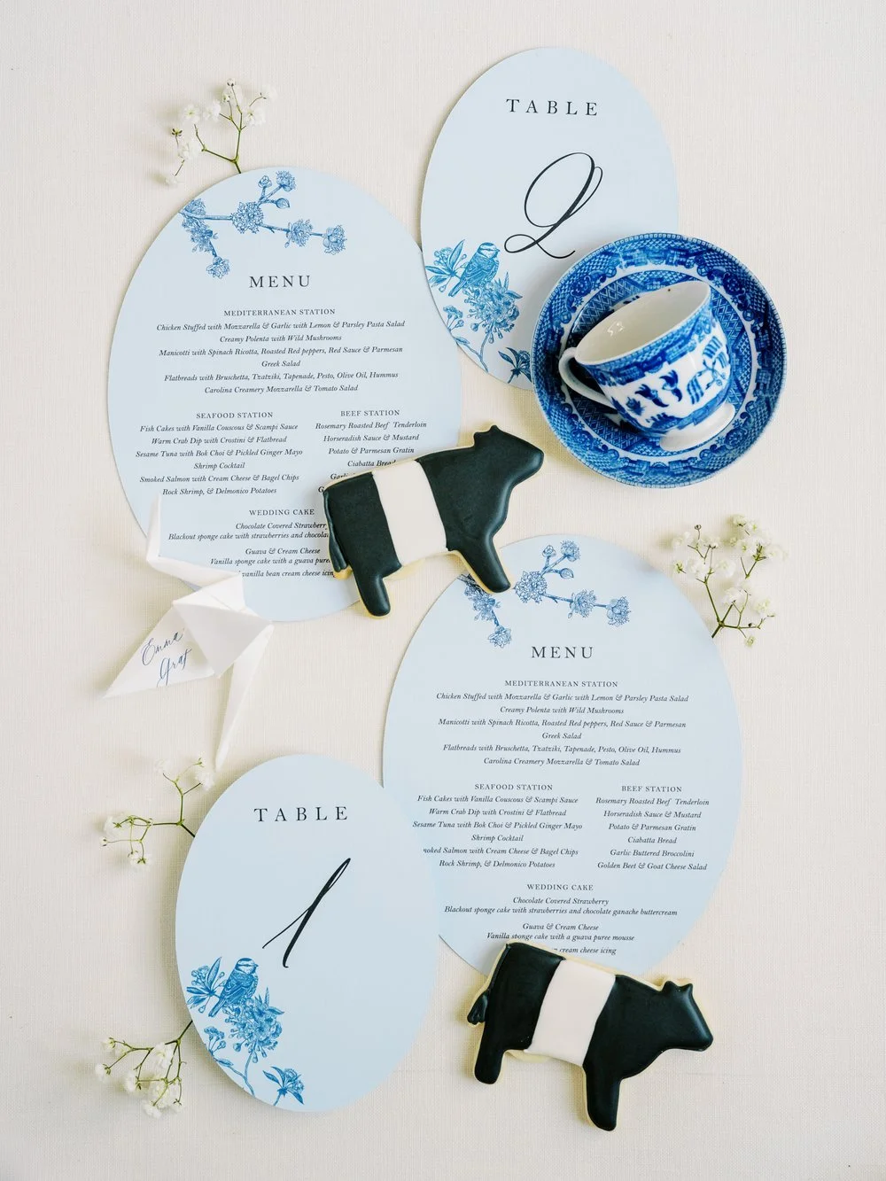 The delicate beauty of Chinoiserie intertwines with the Southern charm of North Carolina at this enchanting Garden Wedding. From the first glimpse of the invitation suite, adorned with intricate Chinoiserie patterns and sealed with symbols of Chinese weddings, guests embark on a journey of harmonized tradition and modernity. As guests arrive, they are welcomed with curated bags reflecting the couple's unique history and passions, setting the tone for a celebration filled with warmth and joy. A vintage oriental screen, a cherished heirloom from the groom's family, serves as a captivating backdrop for the seating chart, guiding guests to their seats with elegance and grace. At the heart of the reception, custom fabric runners adorned with motifs echoing the invitation suite adorn the head table, weaving a thread of continuity and intimacy among loved ones. Each detail, meticulously crafted and thoughtfully chosen, invites guests to share in the love story of two souls united in the splendor of a Chinoiserie Garden Soirée.