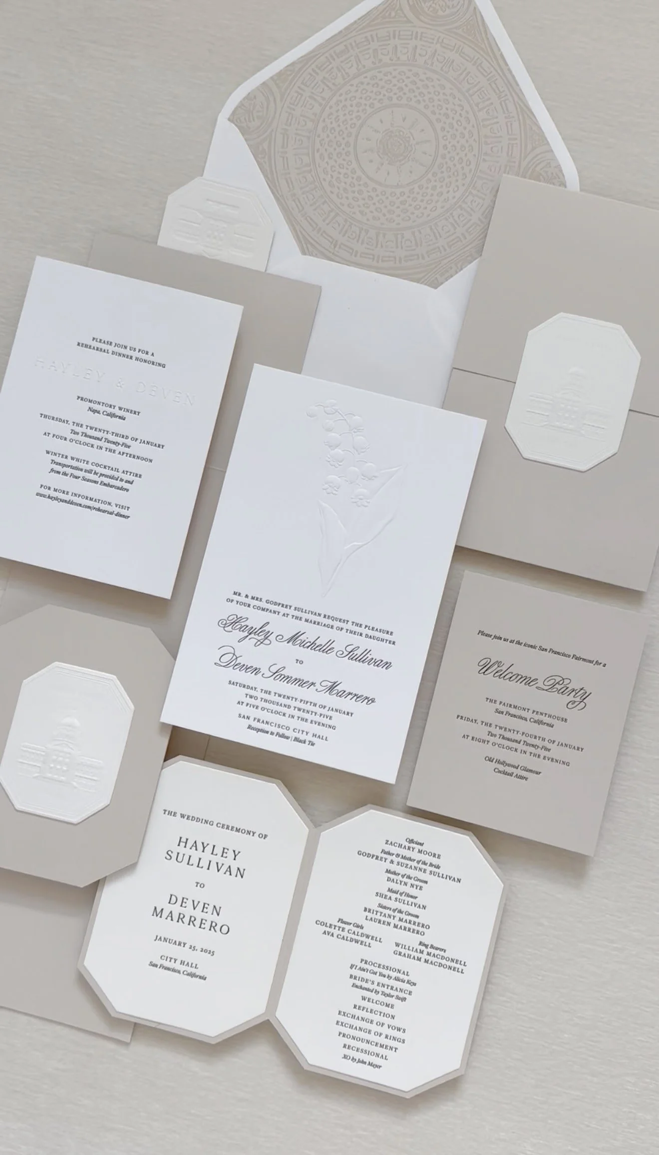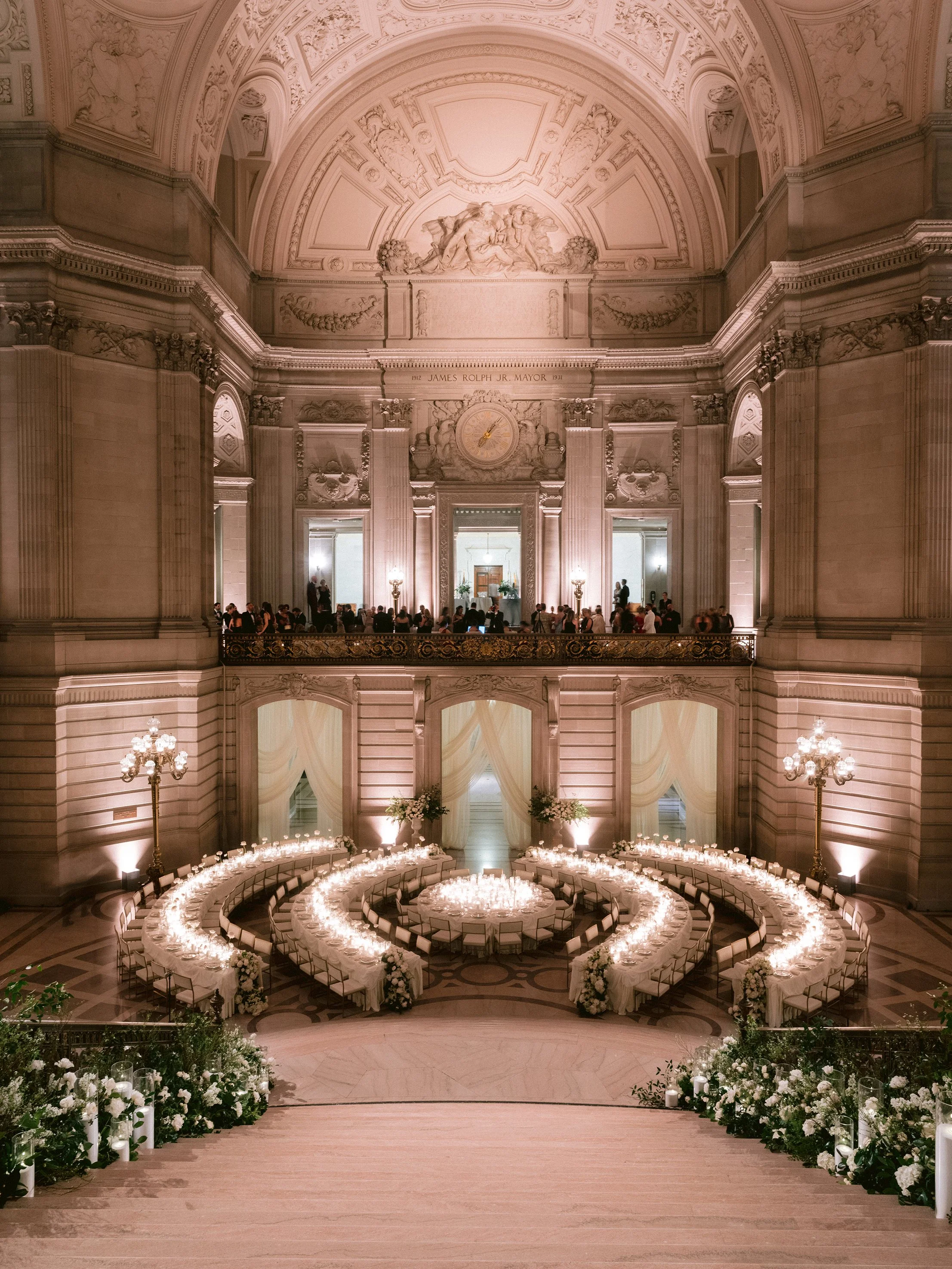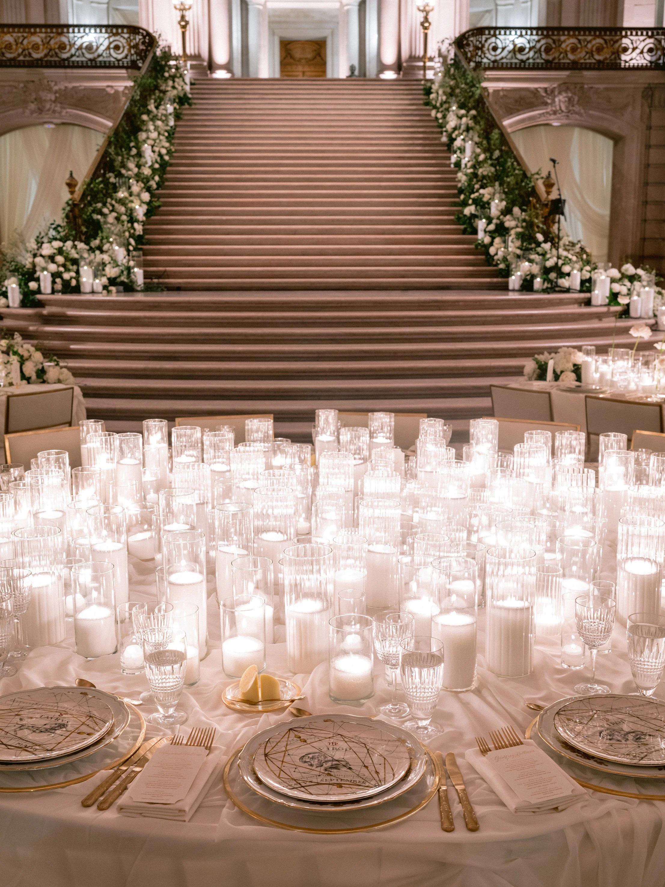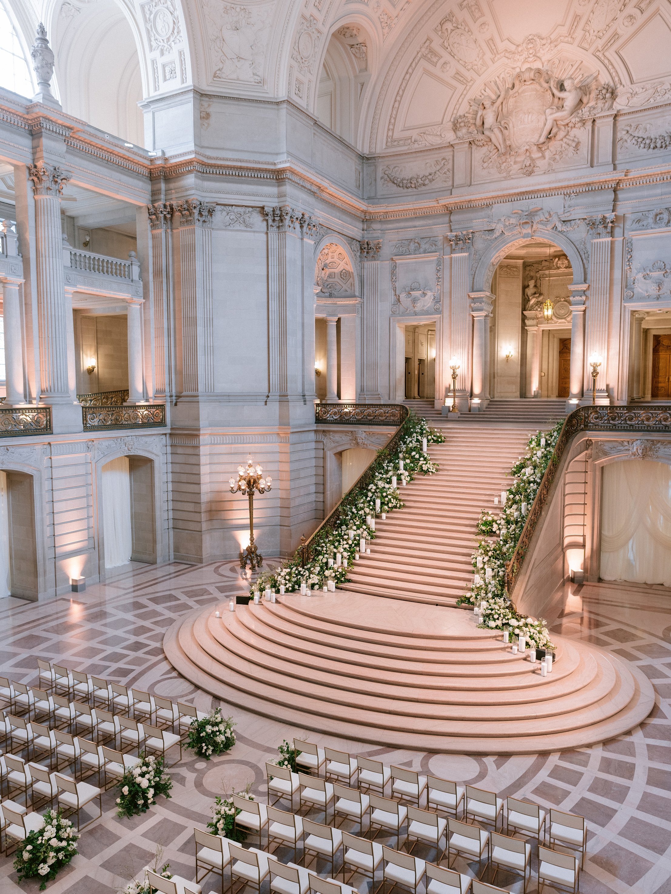 The festivities began with a rehearsal dinner at the Promontory Winery, where sweeping vineyard views created an intimate and refined welcome for their closest guests. From there, the celebration moved to San Francisco for a vibrant welcome party at the Fairmont San Francisco, setting the tone for a weekend that balanced grandeur with effortless elegance. The wedding itself took place in the breathtaking San Francisco City Hall, where the couple exchanged vows beneath its soaring rotunda, surrounded by timeless architecture and soft, romantic light. Thoughtfully designed from beginning to end, the stationery mirrored each setting—offering guests a cohesive and immersive experience that felt as meaningful as it was beautiful.