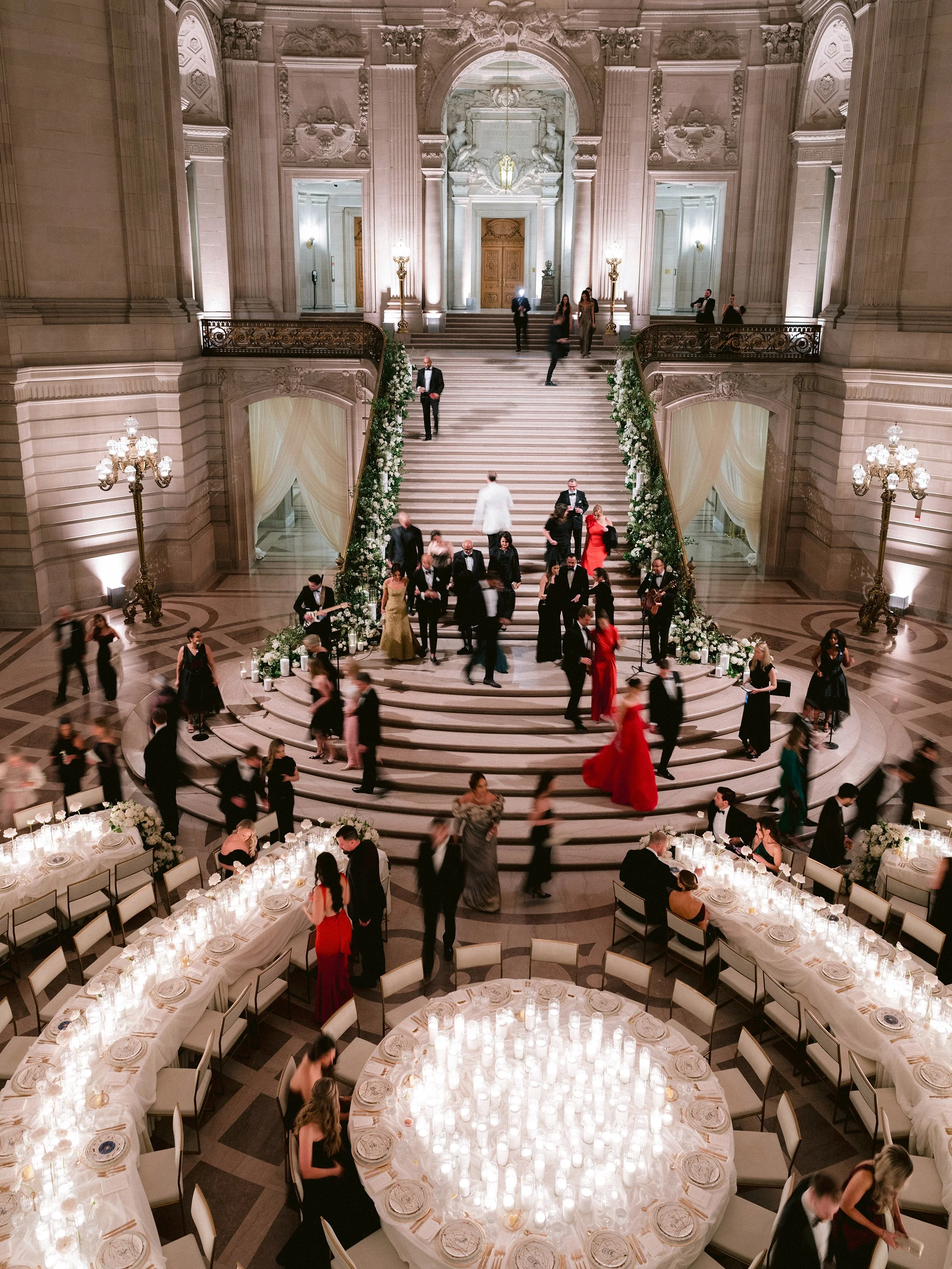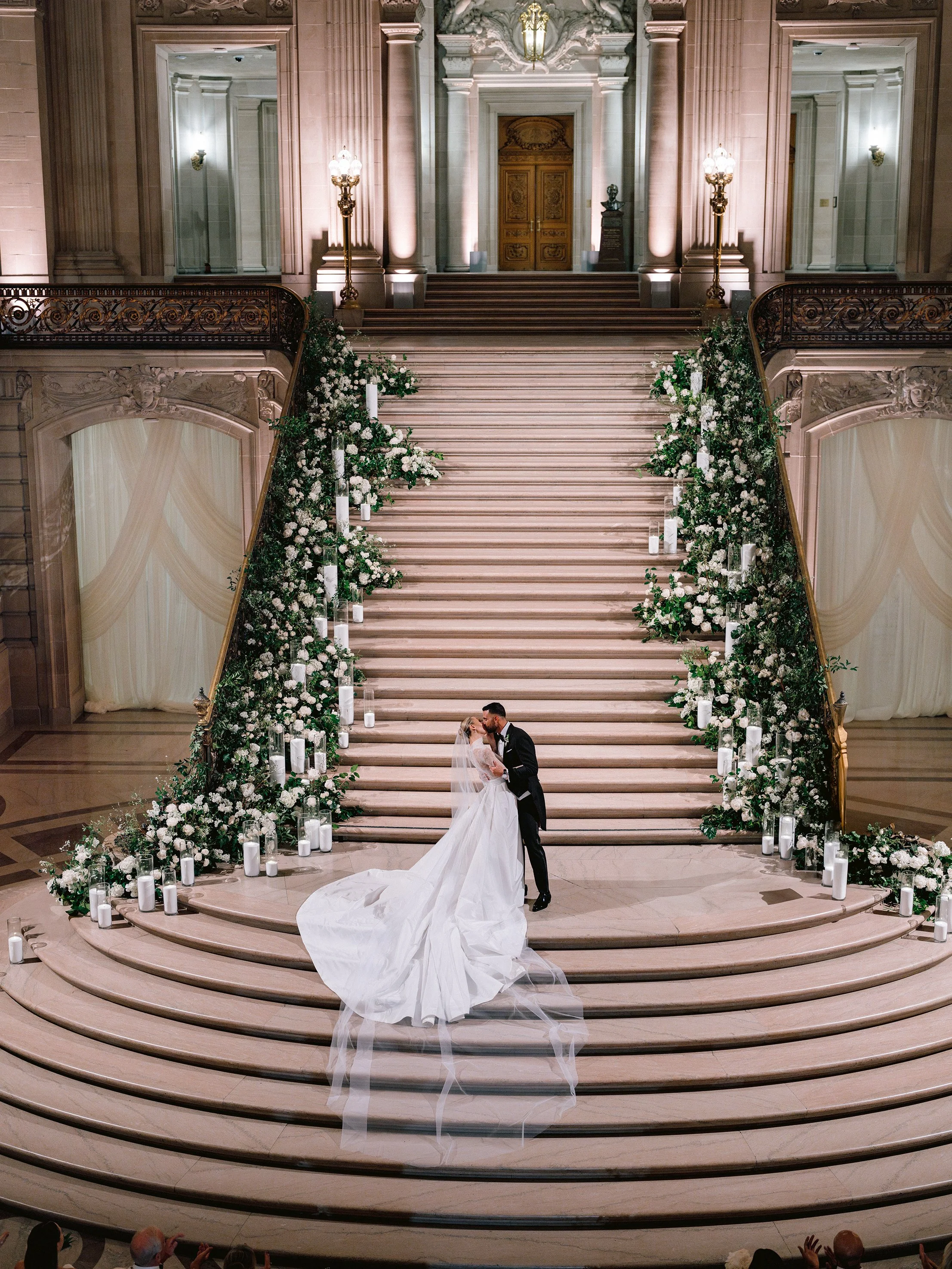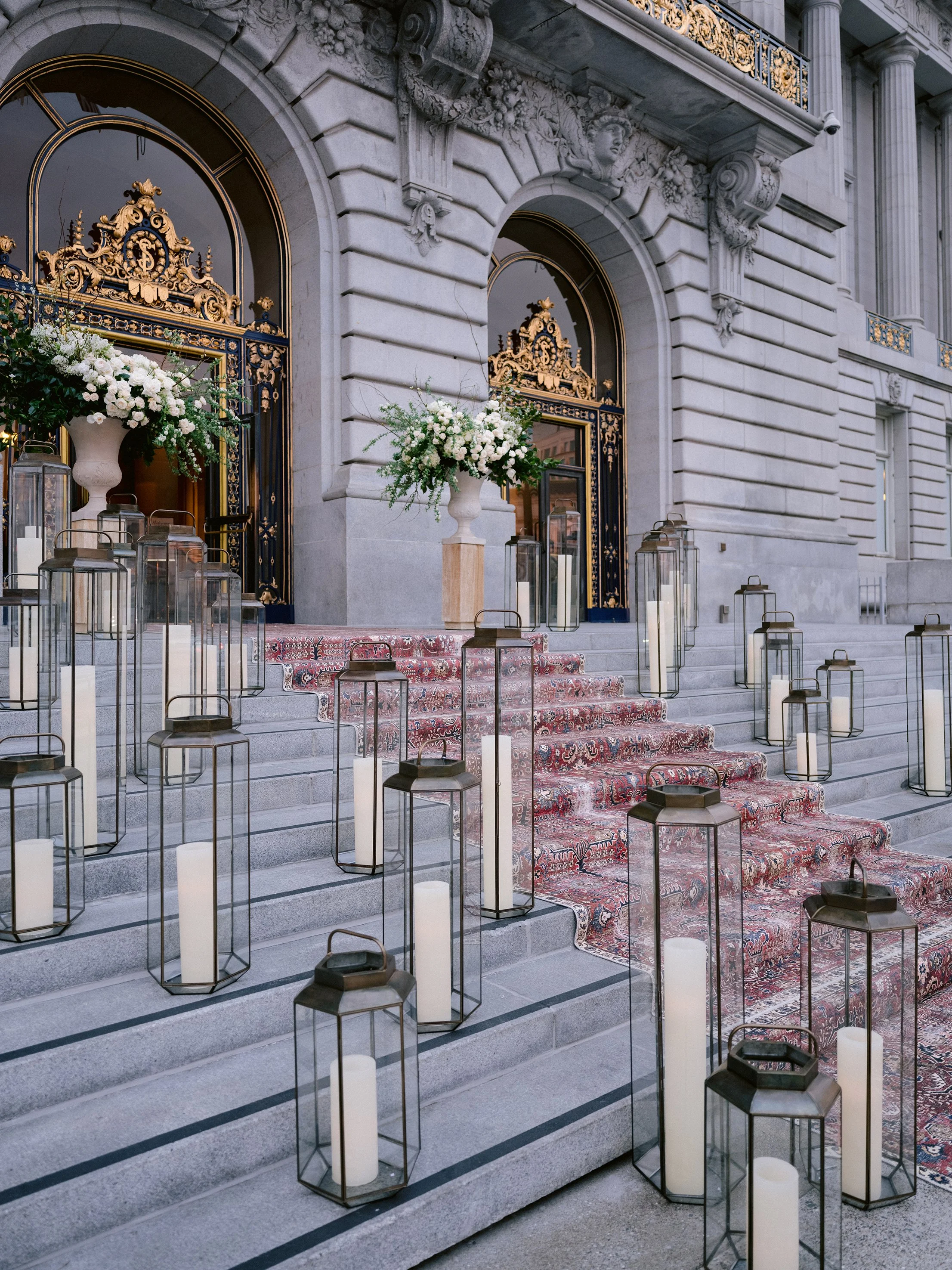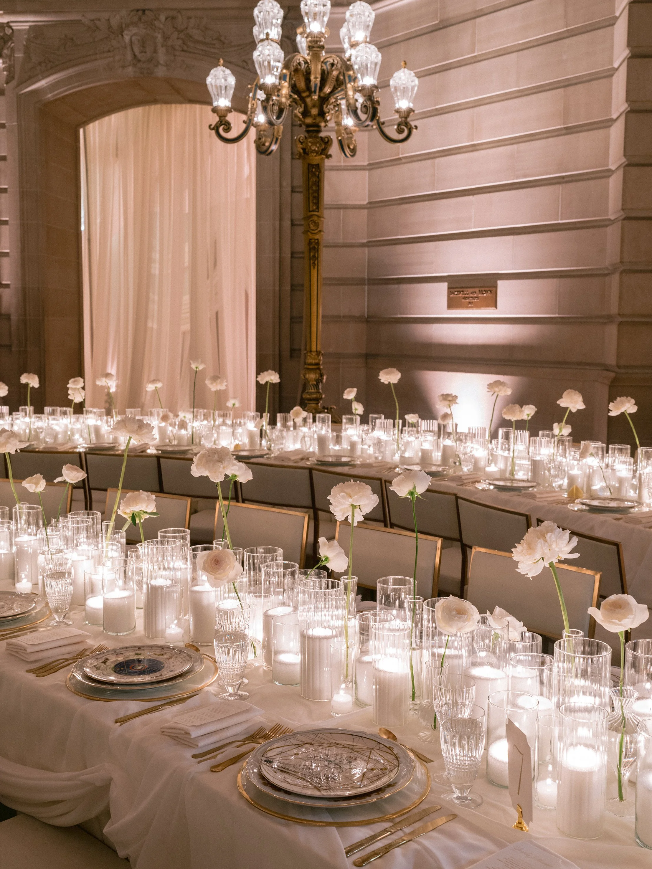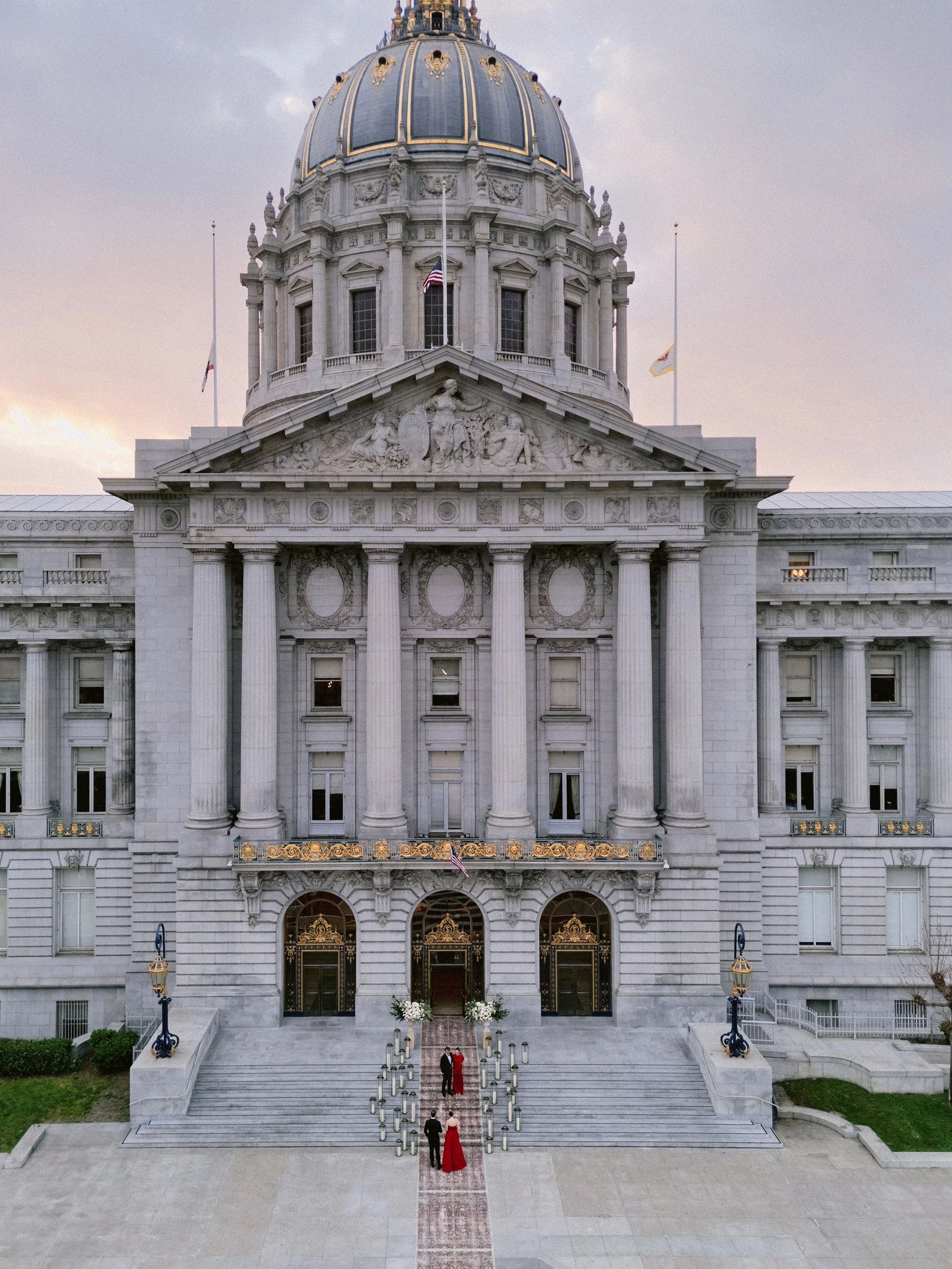 The festivities began with a rehearsal dinner at the Promontory Winery, where sweeping vineyard views created an intimate and refined welcome for their closest guests. From there, the celebration moved to San Francisco for a vibrant welcome party at the Fairmont San Francisco, setting the tone for a weekend that balanced grandeur with effortless elegance. The wedding itself took place in the breathtaking San Francisco City Hall, where the couple exchanged vows beneath its soaring rotunda, surrounded by timeless architecture and soft, romantic light. Thoughtfully designed from beginning to end, the stationery mirrored each setting—offering guests a cohesive and immersive experience that felt as meaningful as it was beautiful.