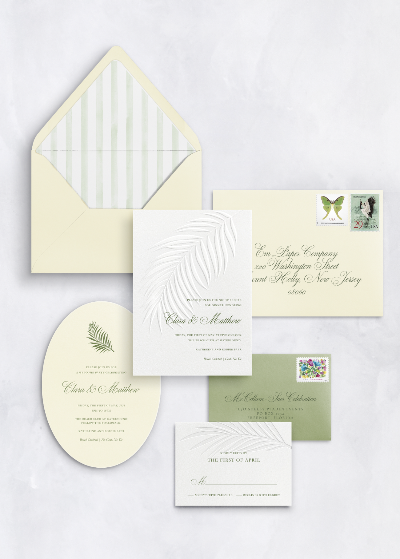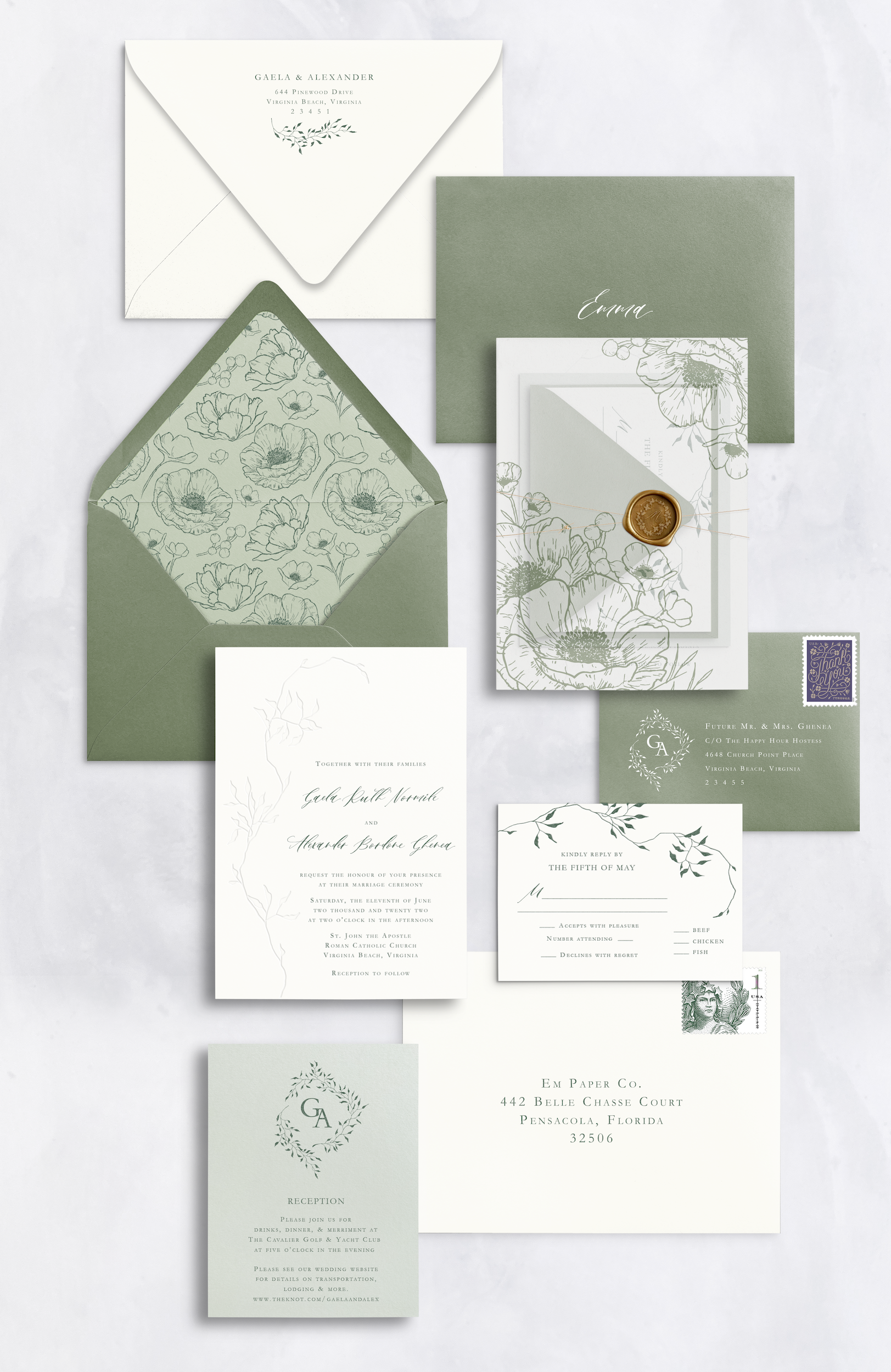 This vintage suite is inspired by the elegance of the Regency era. Created for the couple that appreciates art and literature, the Austen Suite includes a custom passage vellum overlay that can be used to feature a significant romantic poem or a personal love note.
