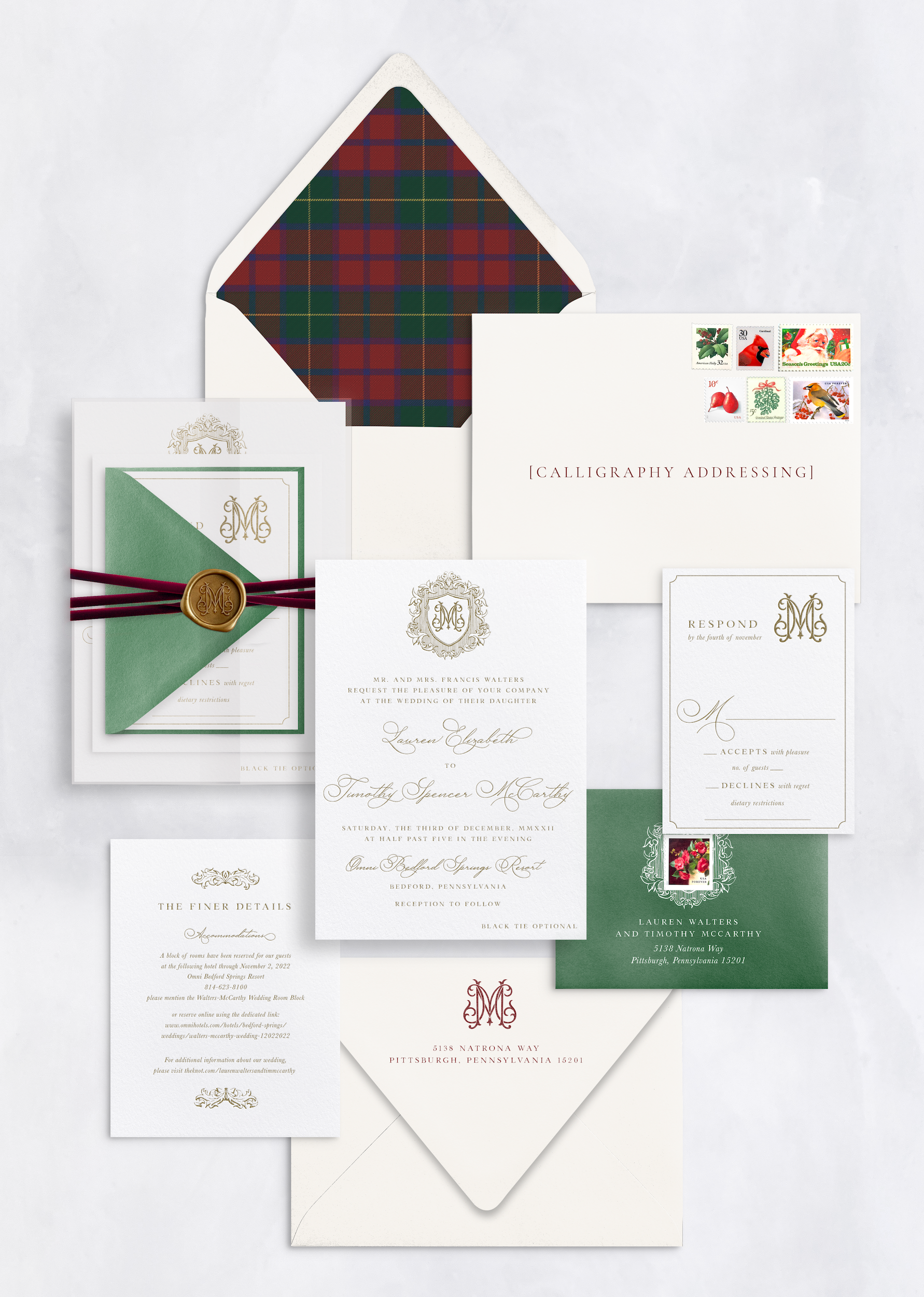 Embellishments: envelope liner, velvet ribbon, vellum jacket, vintage stamps