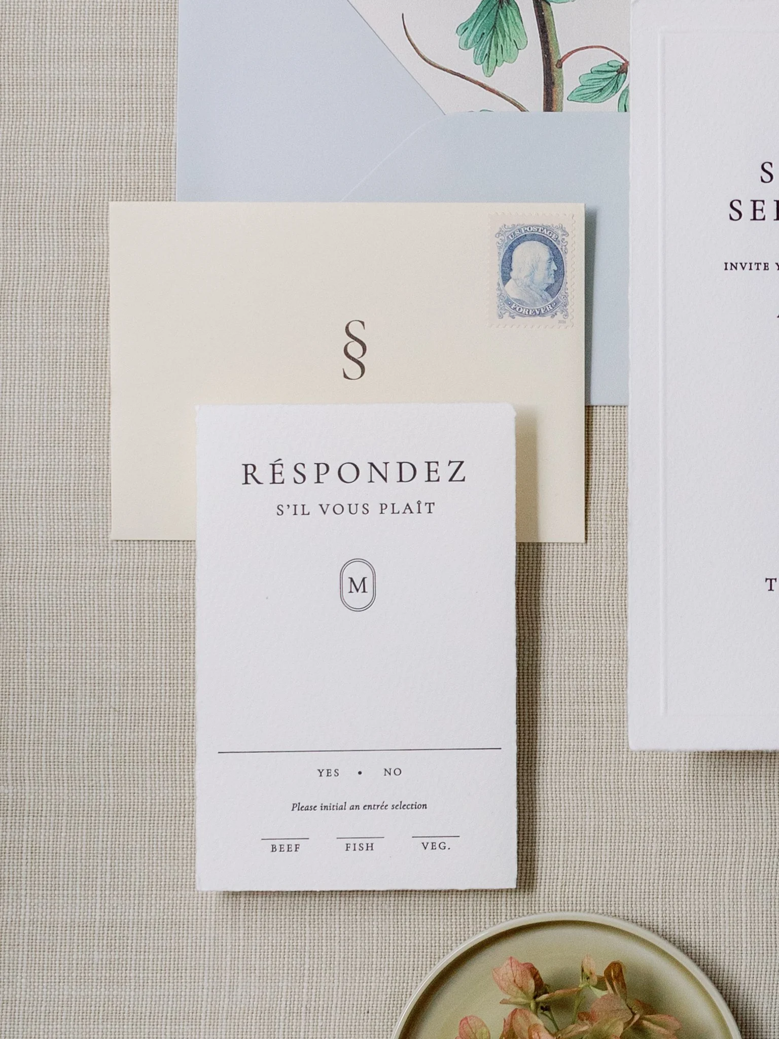 Your design layout will remain the same, but you are able to customize your wording, calligraphy, color palette, and papers. Choose the paper option, print method, and quantity below. Click 'Add to Cart' and fill out the following Semi-Customization Form to personalize your suite. For further customizations, visit the embellishment section.